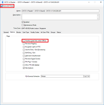 Until the iSTAR firmware can be amended to forcibly turn the “Facility Code when offline” feature off, the following workaround will solve the problem: