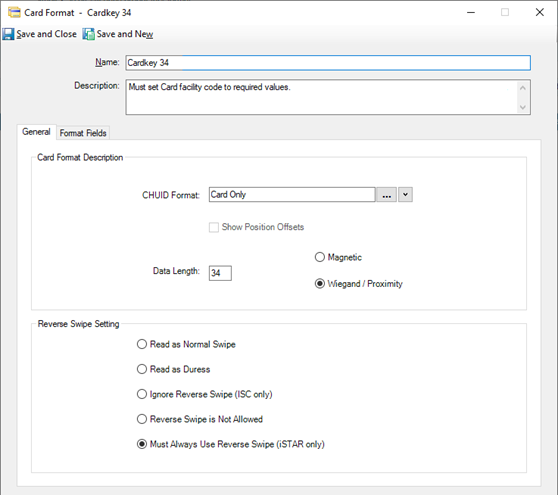The Johnson Controls 34-bit Cardkey format, which in P2000 is referred to as Standard Wiegand, uses a reverse bit order compared to most other card formats. Select the Must Always Use Reverse Swipe (iSTAR only) radio button to reverse the bit stream.