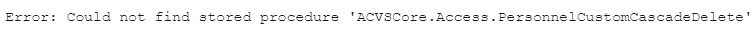 Pull a copy of the stored procedure ‘ACVSCore.Access.PersonnelCustomCascadeDelete’ from an existing 2.80SP2 ACVSCORE database, and re-create the stored procedure in the affected ACVSCORE database.