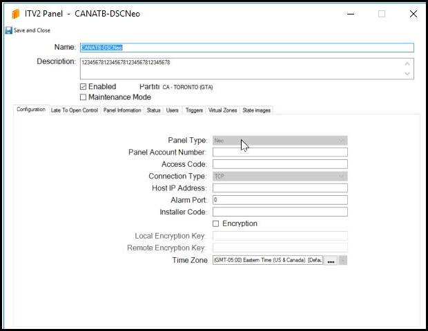 Occasionally, customers have reported that after saving their CCure9000 NEO \ ITv2 Panel configuration, they find that almost all of the fields are empty when they open the panel configuration up afterwards, as in the two ITv2 Panel configuration examples illustrated below. Additionally, the configured ITv2 Panel won’t come online and communicate. Note that it isn’t possible to intentionally configure and save ITv2 Panel configurations in this condition.