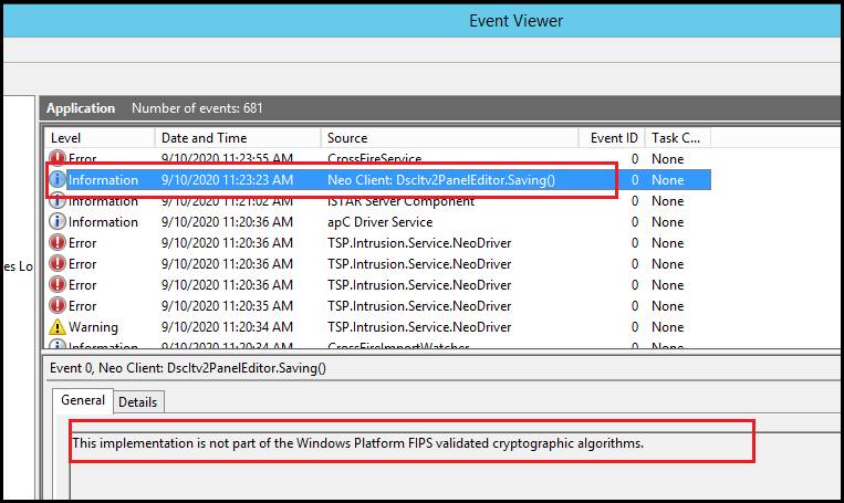A Windows APPLICATION Event Viewer error like the one illustrated below which will be generated each time you attempt to save the NEO \ ITV2 Panel configuration. (note that the APPLICATION Event Viewer error will reference either “NEO” or “ITv2”, depending on which version of the integration you’re currently running). “This implementation is not part of the Windows Platform FIPS validated cryptographic algorithms.”
