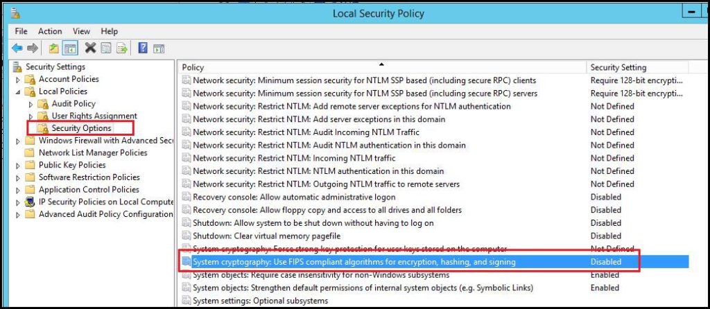 The root cause of this problem is that the System Cryptography Security Policy is enabled on the CCure9000 PC. To resolve this problem, disable the System Cryptography Security Policy as illustrated in the image below. Then, stop and restart the CCure9000 CROSSFIRE Services.