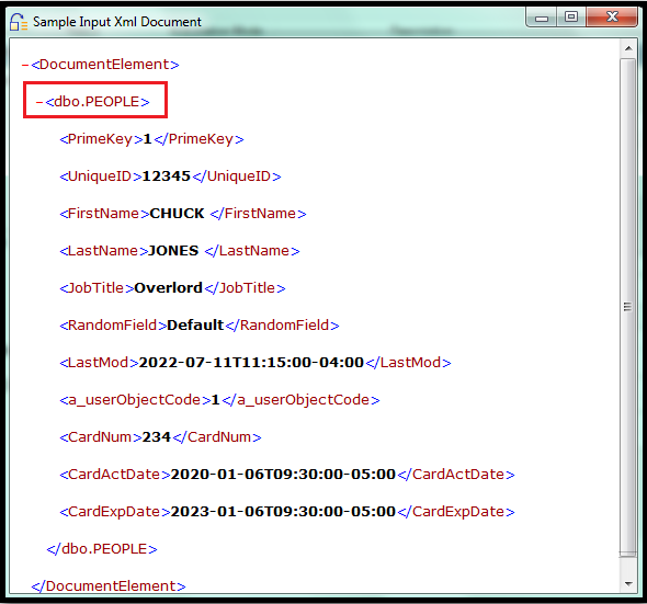 So, to solve this situation, we’ll implement an XSLT script. First, we need to look at the SAMPLE INPUT to take note of the name of the source data tag, which in this example is dbo.PEOPLE.