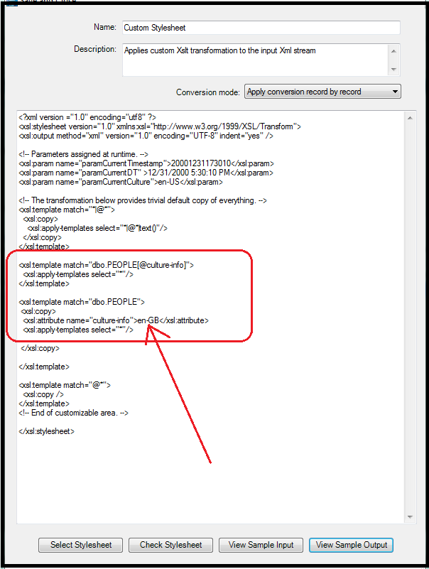 Now when viewing the SAMPLE CONVERTED OUTPUT, the culture-info tag references “en-GB” as specified in the XSLT script. This helps to confirm that the import process is recognizing the Culture that I specified in the XSLT script.