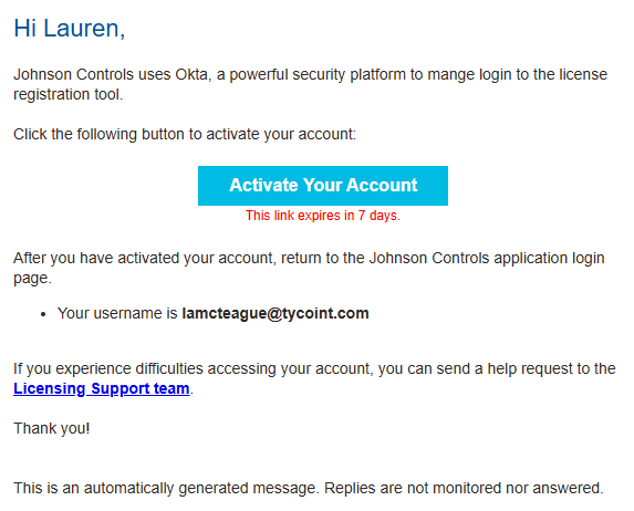 Johnson Controls uses Okta, a powerful security platform to manage login to the license registration tool.