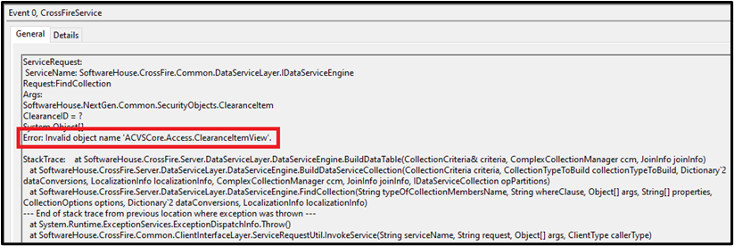 Error: Invalid object name ‘ACVSCore.Access.ClearanceItemView’