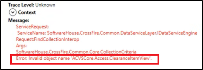 Missing ‘Access.ClearanceItemView’ Database View Preventing Clearance Modifications and Causes Clearance Rejects